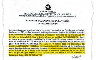 Em depoimento à Polícia Federal, na manhã desta quarta-feira (26/10), o servidor Alexandre Gomes Machado, exonerado do cargo assessor de gabinete da Secretaria Judiciária da Secretaria-Geral da Presidência, do Tribunal Superior Eleitoral (TSE), disse ter informado as supostas falhas na fiscalização e no acompanhamento na veiculação das inserções da [...]