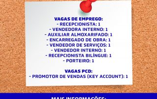 As oportunidades de emprego são para ensino médio completo e superior O Núcleo de Apoio ao Trabalho (NAT) divulga as oportunidades de emprego que foram direcionadas à instituição nesta semana. São nove oportunidades de trabalho em diversas áreas. As vagas são para recepcionista (1), [...]